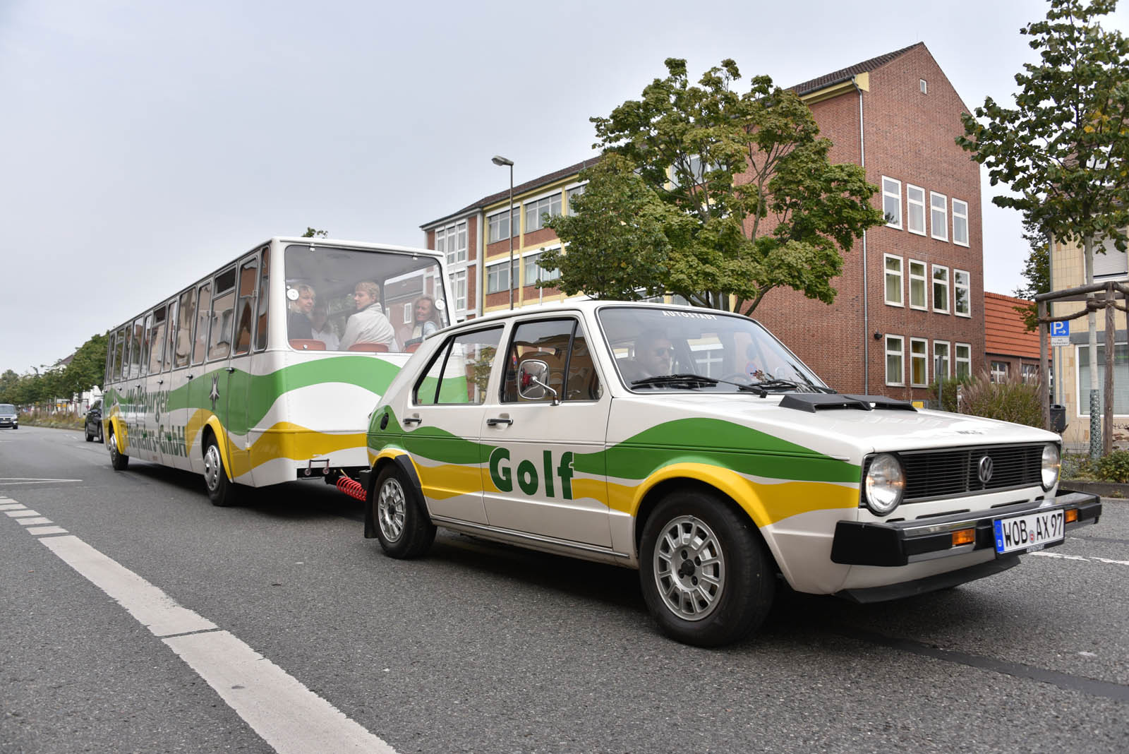 În imagini vedeţi un Golf din prima generaţie, legat la o remorcă pentru 36 de persoane.