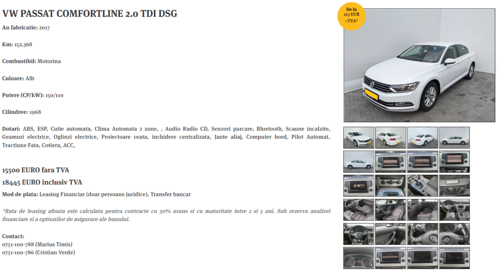 BT Leasing vinde un Passat B8 din anul 2017. Care este prețul cu care se vinde una dintre cele mai populare mașini în România?