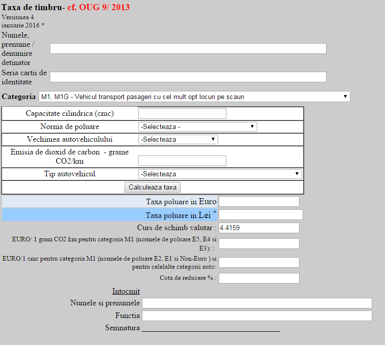 Pentru calcularea timbrului se ia ca referinţă cursul de schimb leu-euro al Bancii Centrale Europene în anul precedent, potrivit Ordonanţei de urgenţă a Guvernului nr. 9/2013. În această ordonaţă este specificat: „valoarea în lei a timbrului se determină pe baza cursului de schimb valutar al monedei euro stabilit în prima zi lucrătoare a lunii octombrie din anul precedent şi publicat în Jurnalul Oficial al Uniunii Europene”.