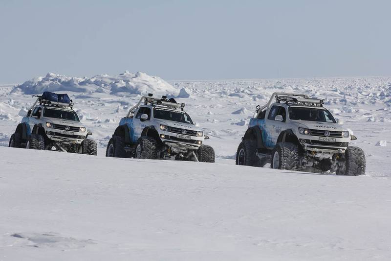 La care se mai adaugă trei maşini, probabil cele mai capabile maşini VW construite până acum. Este vorba despre cele trei modele VW Amarok special preparate, care au făcut parte din expediţia ”Amarok Polar”.