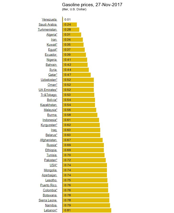 Dacă şoferii europeni şi cei americani duc grija preţului carburanţilor, nu acelaşi lucru se întâmplă şi în cazul cetîţenilor altor ţări, care se bucura de preţuri infime la pombă. “De vina” sunt subvenţiile oferite de statele în care traiesc. Site-ul globalpetrolprices.com a facut publice preţurile la pompa în diverse colţuri ale lumii, arătând astfel care sunt statele care se bucură de tarife avantajoase.