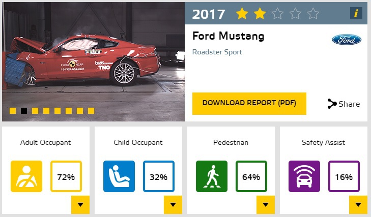 De departe, cele mai slabe rezultate le-a primit Ford Mustang (doar două stele). Pe când celelalte două modele testate au primit punctaj maxim.