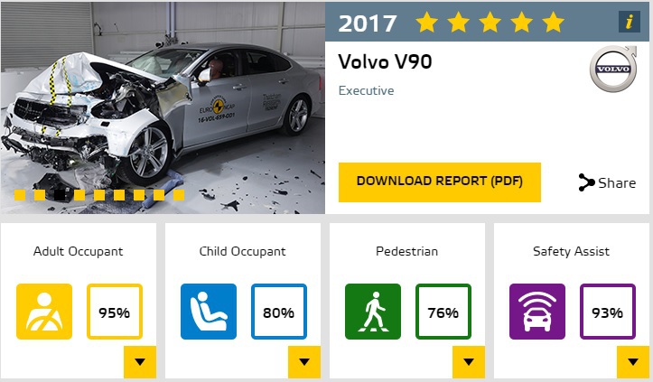 Pe final de ianuarie, organismul european Euro NCAP a publicat rezultatele (primele din 2017) crash-testelor efectuate pe un număr de trei maşini: Volvo V90, Volvo S90 şi Ford Mustang.