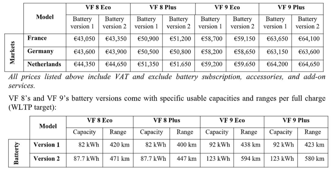 În Franța, prețurile pentru VF 8 Eco încep de la 43.050 euro și cresc cu 300 euro pentru bateria mai mare. Prețurile pentru VF 8 Plus cresc la 50.900 euro și 51.200 euro pentru diferitele baterii, în timp ce prețul pentru VF 9 începe de la 58.700 euro și ajunge la 64.100 euro.