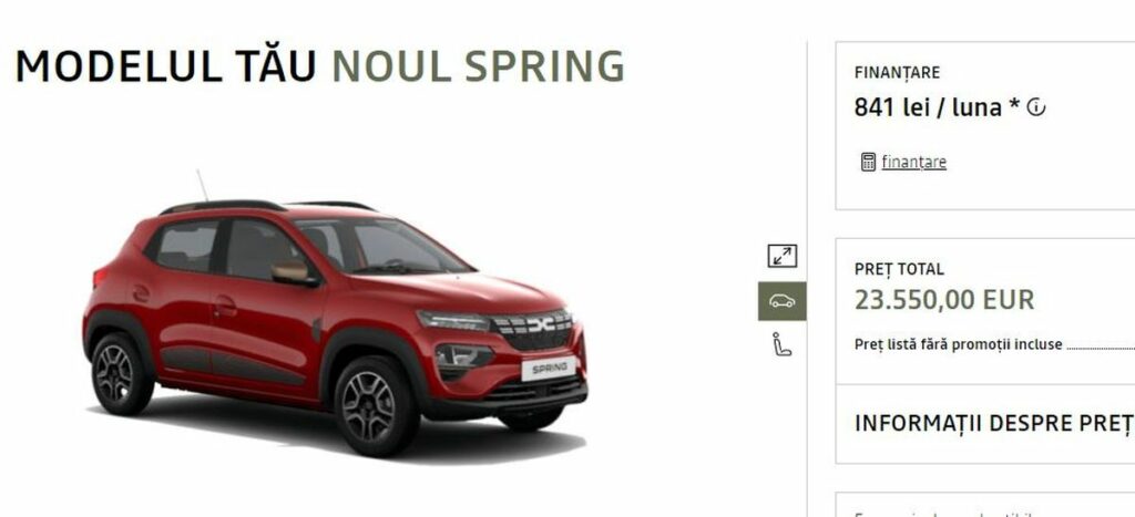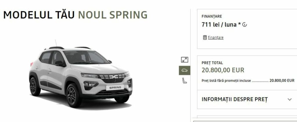 Cu doi ani în urmă un autoturism electric Dacia Spring cu versiunea de echipare „Comfort” se vindea în România la prețul de 16.800 de euro cu TVA inclus.