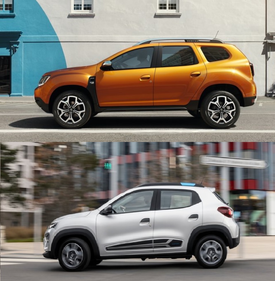 Din punct de vedere al ampatamentului, Dacia Spring este cu 251 de mm mai mică decât Duster. În privința spațiului de încărcare al portbagajului, Dacia Duster este mai încăpătoare cu 155 de litri.