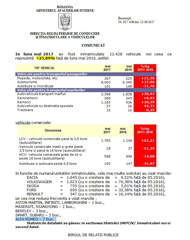 Conform unor calcule publicate de Direcţia Regim Permise Bucureşti, în luna mai a acestui an, au fost înmatriculate 12.428 vehicule noi ceea ce reprezintă +25,89% faţă de luna mai 2016. Din acestea doar 8.062 sunt autoturisme, restul fiind trecute la categorii precum mopede, motociclete, autovehicule transport marfuri sau remorci.