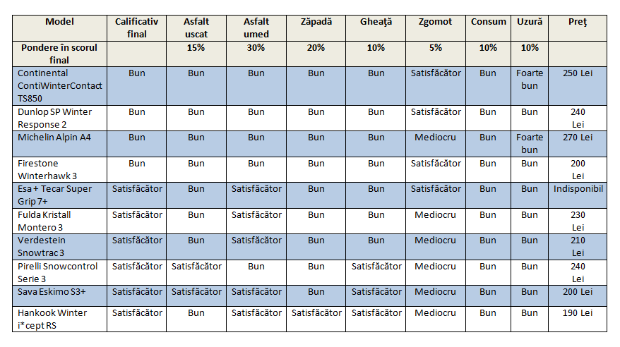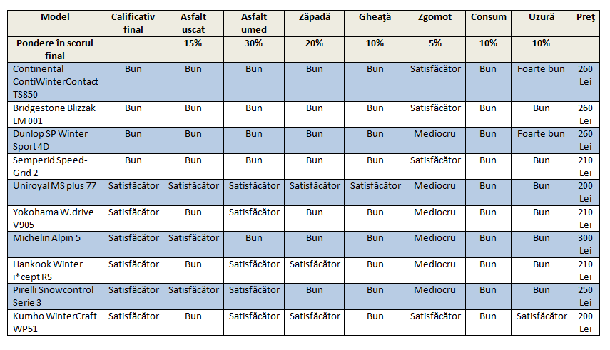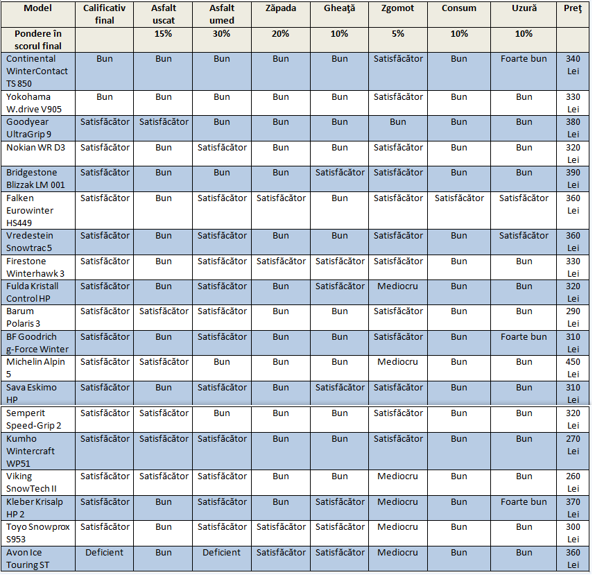 În timp ce tabele privind mărimile 175/65 R14 T şi 195/65 R15 T sunt pe făcute pe baza topului realizat anul trecut de ADAC, fiind actualizate preţurile, tabelul privind mărimea 205/55 R 16 H  este bazat pe o nouă testare făcute de clubul german.
