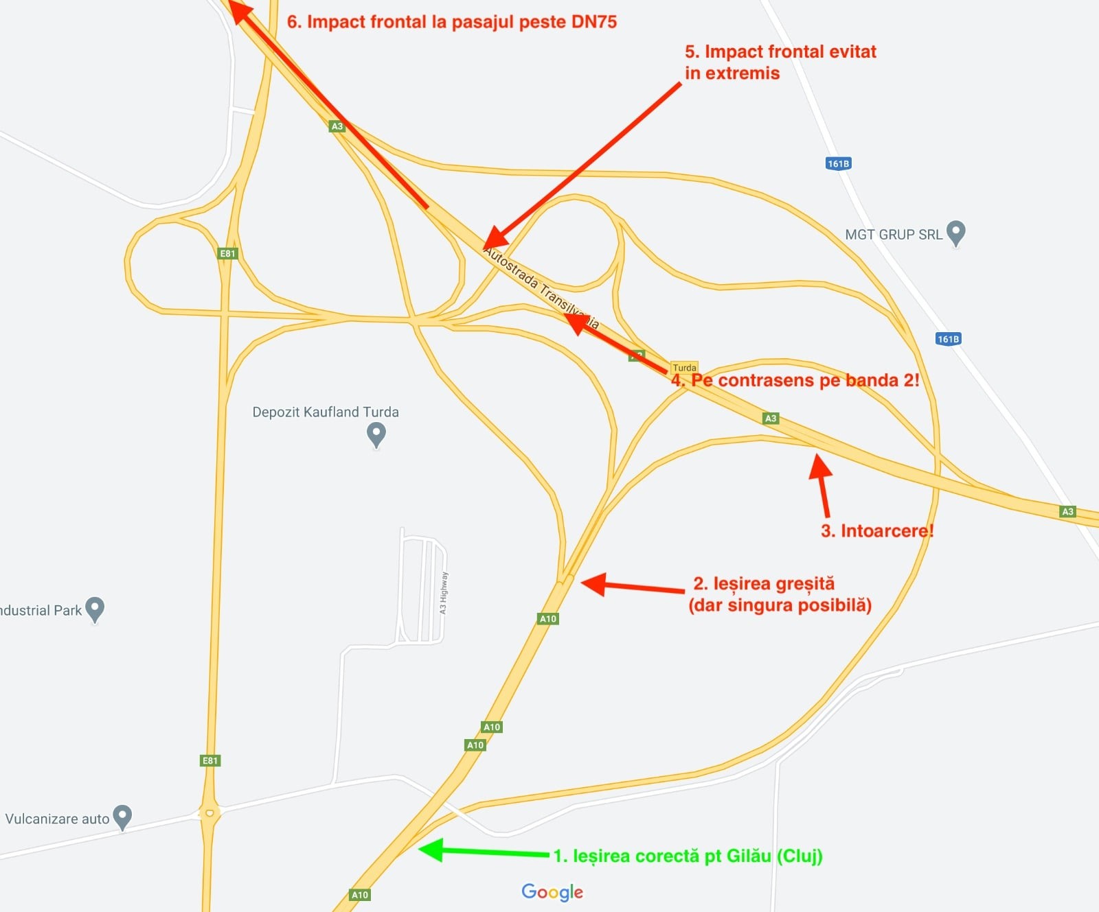 Specialiștii Pro Infrastructură dau ca exemplu de manual cazul șoferului surprins zilele trecute circulând pe contrasens într-un Renault Clio roșu. Acesta a fost evitat în ultima secundă de mai mulți șoferi. S-a întâmplat în zona nodului Turda de pe autostrada A3. Dacă vă întrebați ce s-a întâmplat până la urmă în acest caz, vă spunem că șoferul a produs până la urmă un accident frontal, așa cum era de așteptat. Din fericire, acesta nu a avut consecințe grave.