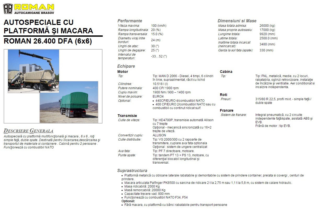 ROMAN 26.400 DFA (6×6) este o autospecială cu platformă multifuncţională şi macara, 6 x 6, cu roţi simple în partea din faţă, şi duble spate. Acest vehicul este destinată pentru încarcarea, descărcarea şi transportul de materiale şi containere. Cabina poate transporta două persoane.