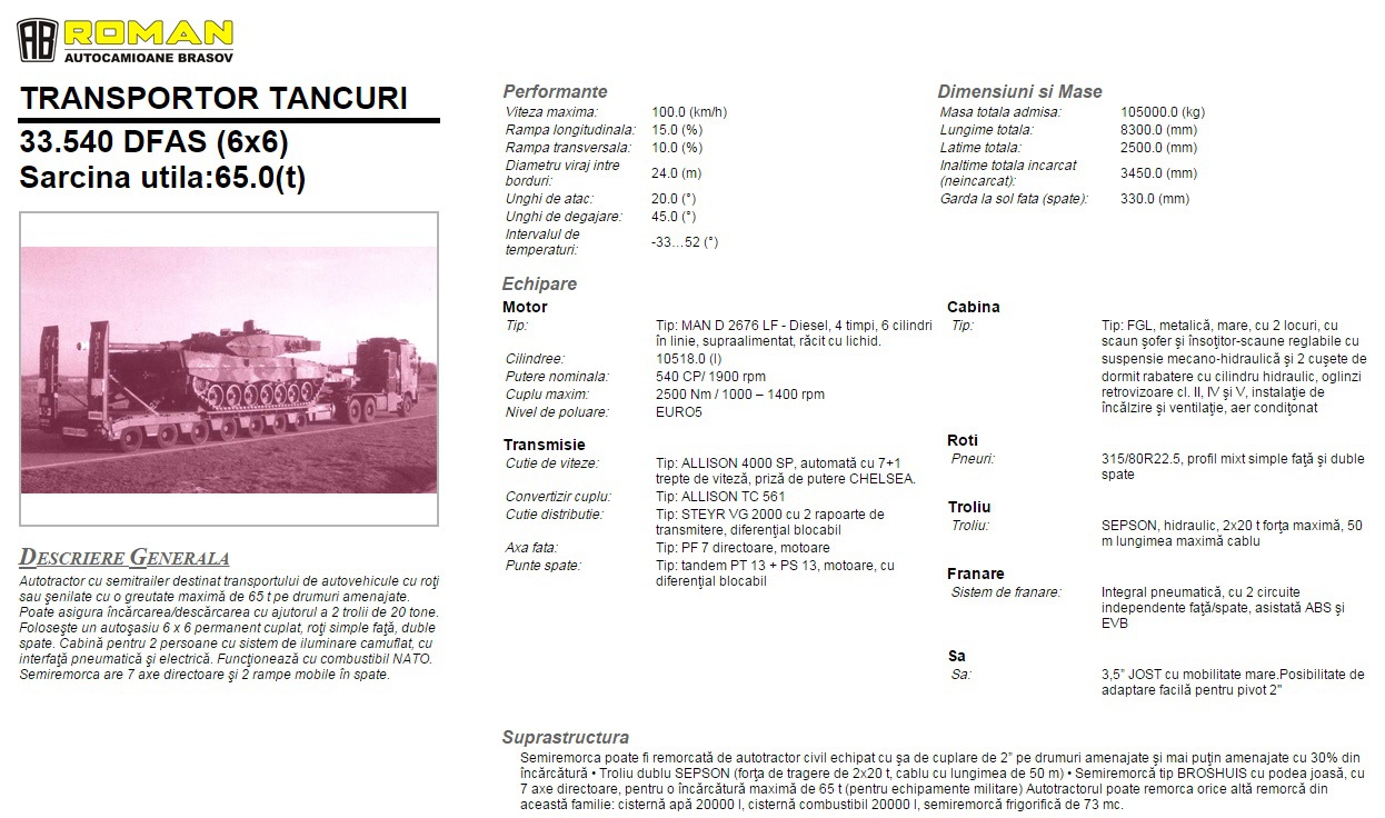 33.540 DFAS (6×6) este un autotractor cu semitrailer destinat transportului de autovehicule cu roţi sau şenilate cu o greutate maximă de 65 t pe drumuri amenajate. Poate asigura încărcarea/descărcarea cu ajutorul a doi troli de 20 de tone. Foloseşte un autoşasiu 6×6 permanent cuplat, roţi simple faţă, duble spate. Cabină pentru două persoane cu sistem de iluminare camuflat, cu interfaţă pneumatică şi electrică. Funcţionează cu combustibil NATO. Semiremorca are şapte axe directoare şi două rampe mobile în spate.