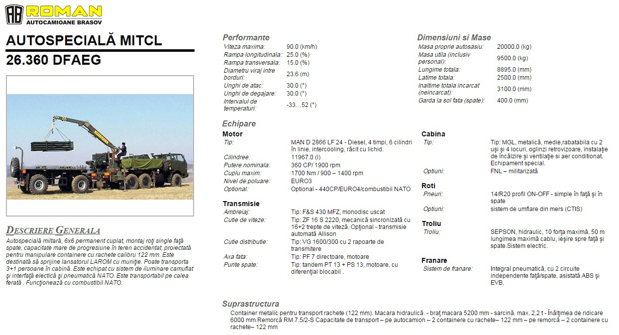 26.360 DFAEG este o autospecială miltară, 6×6 permanent cuplat, montaj roţi single faţă spate, capacitate mare de progresiune în teren accidentat, proiectată pentru manipulare containere cu rachete calibru 122 mm. Este destinată să sprijine lansatorul LAROM cu muniţie. Poate transporta 3+1 persoane în cabină. Este echipat cu sistem de iluminare camuflat şi interfaţă electică şi pneumatică NATO. Este transportabil pe calea ferată . Funcţionează cu combustibil NATO.