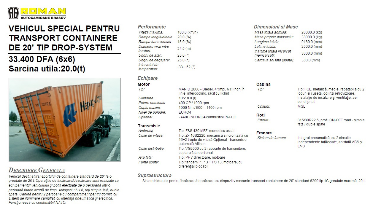 33.400 DFA este un vehicul destinat transportului de containere standard de 20’ la o greutate de 20 t. Operaţiile de încărcare/descărcare sunt realizate cu echipamentul vehiculului şi pot fi efectuate de o persoană într‑o perioadă foarte scurtă de timp. Autoşasiu 6×6, roţi simple faţă, duble spate. Cabină pentru două persoane cu compartiment pentru dormit, cu sistem de iluminare camuflat, cu interfaţă pneumatică şi electrică.