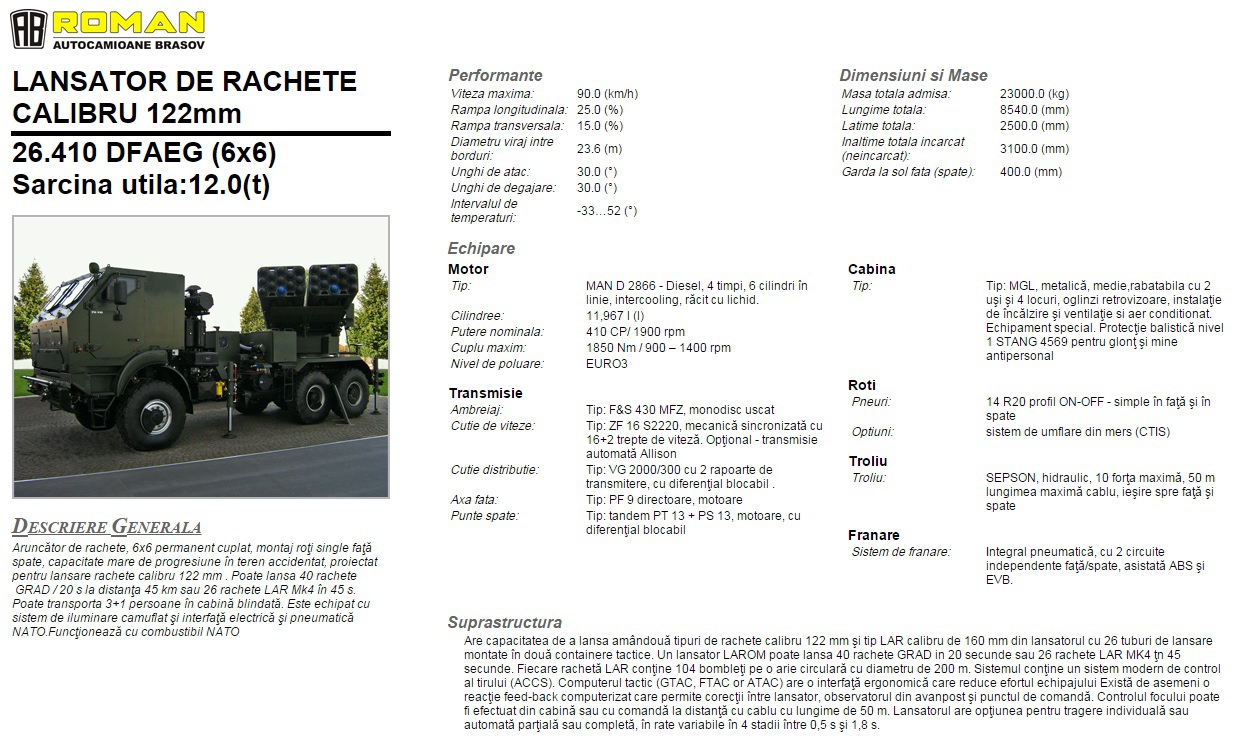 26.410 DFAEG este un lansator de rachete care se descurcă foarte bine pe teren accidentat, poate lansa 40 rachete GRAD / 20 s la o distanţa de 45 km sau 26 rachete LAR Mk4 în 45 s, poate transporta 3+1 persoane în cabină blindată, este echipat cu sistem de iluminare camuflat şi interfaţă electrică şi pneumatică NATO.