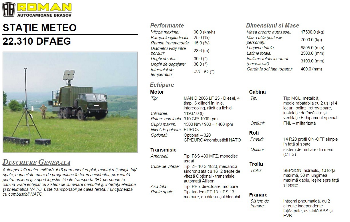22.310 DFAEG este o autospecială meteo militară, 6×6, proiectată pentru artilerie şi suport logistic. Poate transporta 3+1 persoane în cabină şi este transportabilă pe calea ferată. Funcţionează cu combustibil NATO.