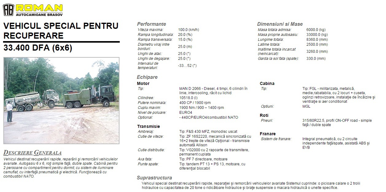 33.400 DFA (6×6) este un vehicul destinat recuperării rapide, reparării şi remorcării vehiculelor avariate. Are un autoşasiu 6×6, roţi simple faţă, şi duble pe spate. Cabină pentru 2 persoane cu compartiment pentru dormit, cu sistem de iluminare camuflat, cu interfaţă pneumatică şi electrică. Funcţionează cu combustibil NATO.