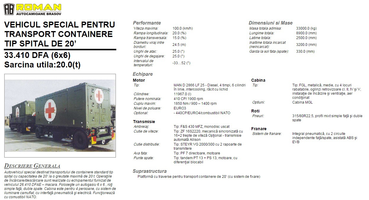 33.410 DFA (6×6) este un autovehicul special destinat transportului de containere standard tip spital cu capacitatea de 20’ la o greutate maximă de 20 t. Operaţiile de încărcare/descărcare sunt realizate cu echipamentul furnizat de vehiculul 26.410 DFAE – macara. Foloseşte un autoşasiu 6 x 6, roţi simple pe partea din faţă, şi duble în spate. Cabina este pentru 4 persoane, cu sistem de iluminare camuflat, cu interfaţă pneumatică şi electrică. Funcţionează cu comustibil NATO.