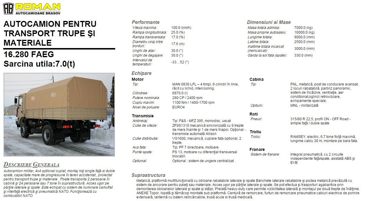 16.280 FAEG este un autocamion militar, 4×4 opţional cuplat, capacitate mare de progresiune în teren accidentat, proiectat pentru transport trupe şi materiale. Poate transporta 2 persoane în cabină şi 24 persoane sau 7 tone în suprastructură. Acces uşor pe părţile laterale şi spate. Este echipat cu sistem de iluminare camuflat şi interfaţă electrică şi pneumatică NATO.