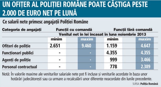 Cel mai bine plătit poliţist din România are un salariu net de aproape 9.500 de lei pe lună, mai mare decât al preşedintelui ţării. Totuşi, salariul de la care se porneşte pentru un agent de poliţie era de 1.000 de lei în noiembrie 2013.