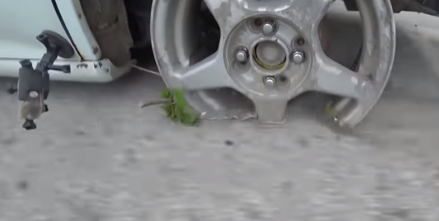 În primele momente vedem cu anvelopa se freacă de asfalt până când face explozie, apoi se toceşte până la jantă şi tot aşa.