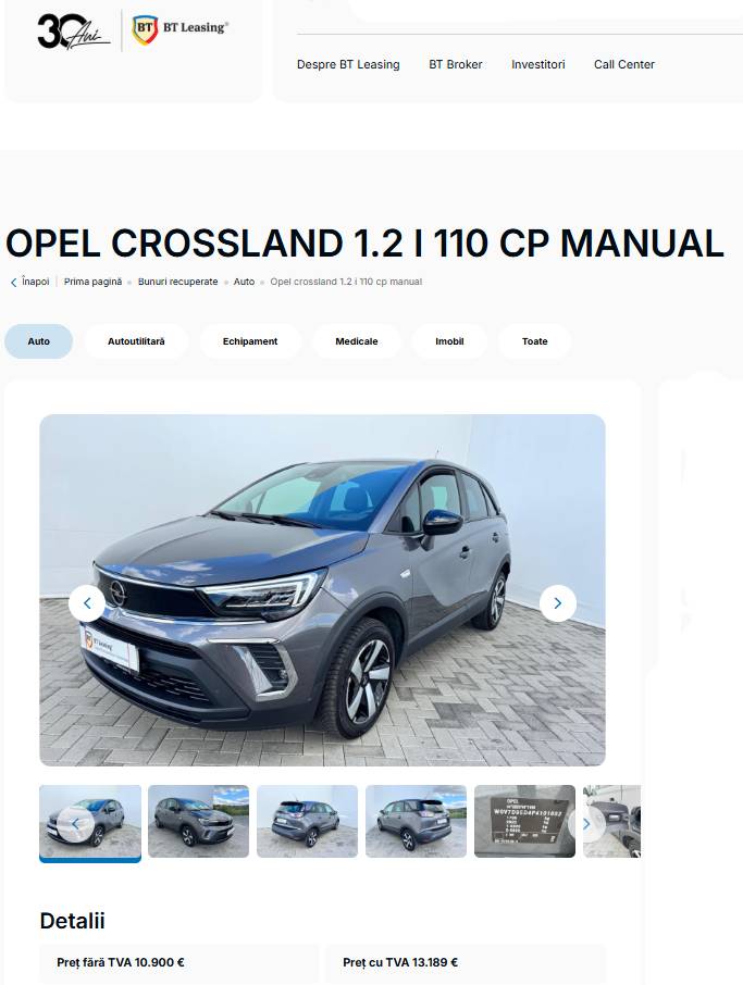 Continuând cu Opel, dar schimbând anul și modelul, ajungem la un Opel Crossland fabricat în 2023. Cu 71.706 km rulați, acesta posedă un motor de 1,2L pe benzină ce generează 110 cp. Acesta are o echipare similară modelului anterior însă actualizată cu faruri LED, Asistent de fază lungă, Lane Assist, tracțiune față, diverși senzori și climă automată cu 2 zone. Cu toate că prețul a crescut la 13.189 de euro cu TVA, dotările mai moderne și anul de fabricație mai apropiat de prezent fac acest SUV atractiv.