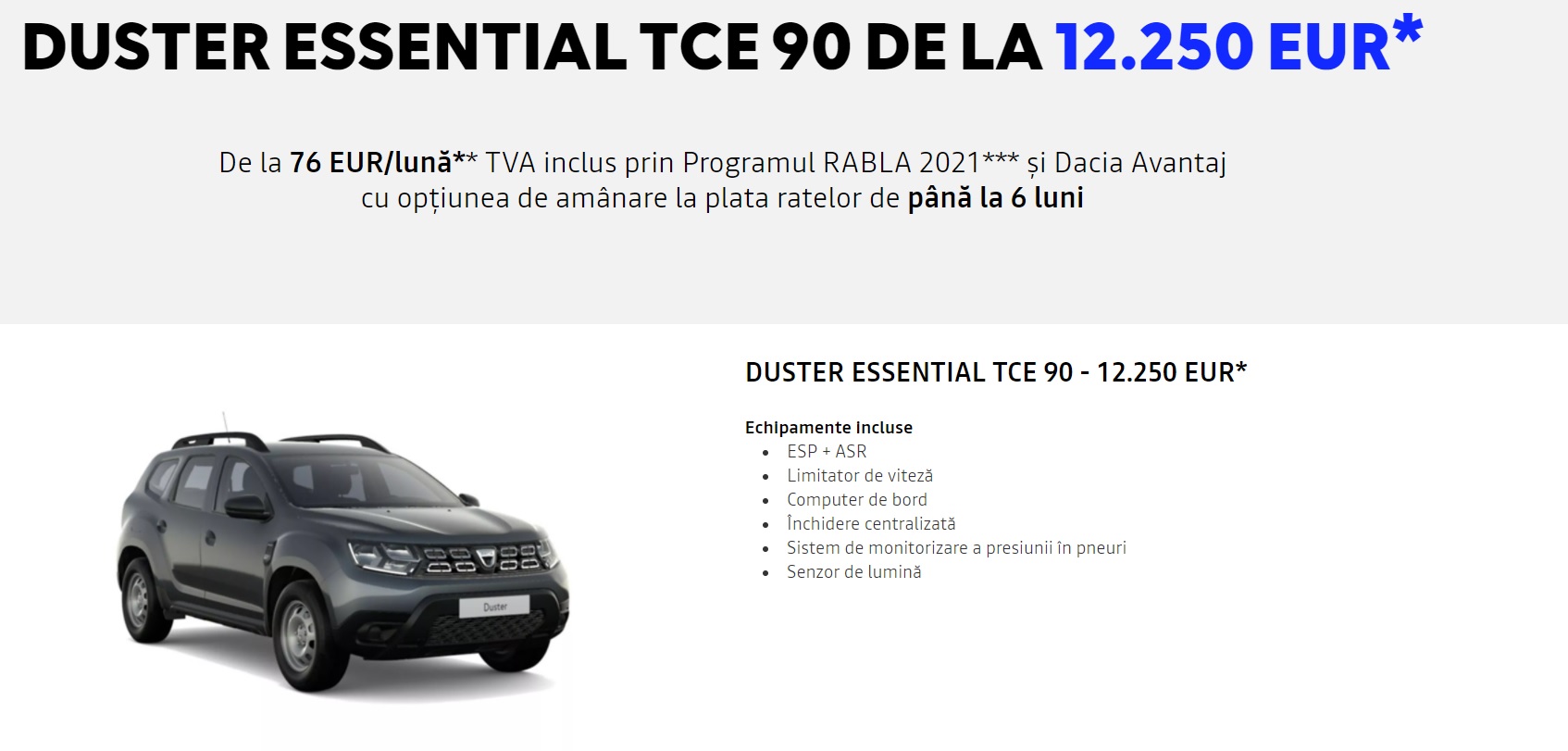 Ofertă este destinată persoanelor fizice și este valabilă în perioada 1 – 30 aprilie 2021. Prețul este obținut prin scăderea din prețul standard a contravalorii primei de casare RABLA 2021 de 7.500 lei și a reducerii oferite de Renault Commercial Roumanie în valoare de 270 Euro (TVA inclus) pentru Duster Essential TCe 90. Prețul nu conține valoarea oricăror echipamente, accesorii sau dotări opționale.