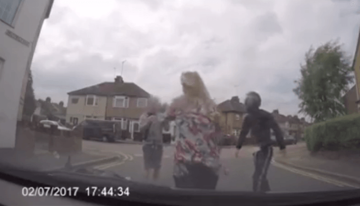 Clipul de 48 de secunde arată cum şoferiţa şocată iese din maşină şi se confruntă cu bărbatul de pe scuter, strigând: