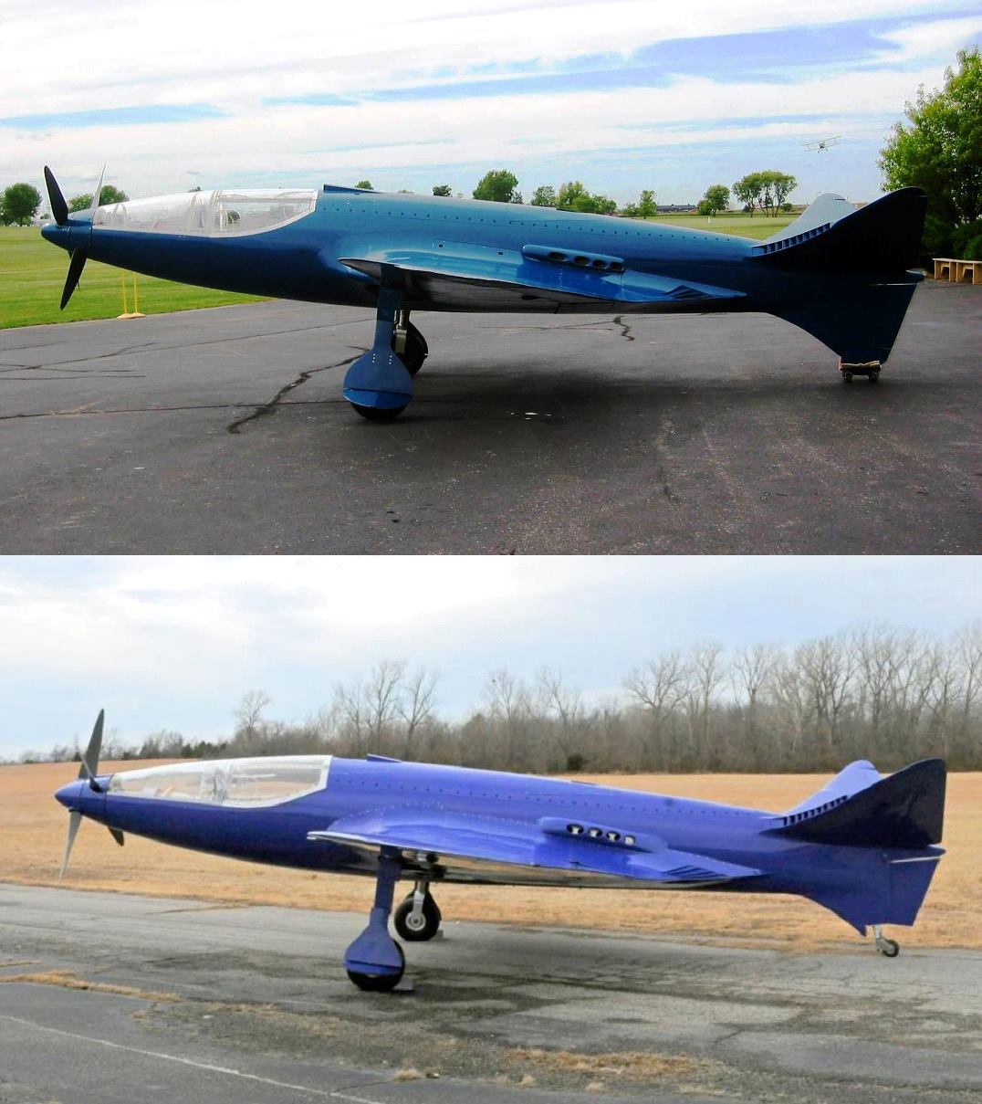 După un test de succes la sol, pilotul Scotty Wilson a decolat şi a zburat cu minunata replică de Bugatti 100P. Din păcate, sistemul de frânare a cedat la aterizare, iar avionul s-a oprit cu botul în iarba de la capătul pistei de aterizare, însă e o mică problemă în viaţa unui avion de excepţie.