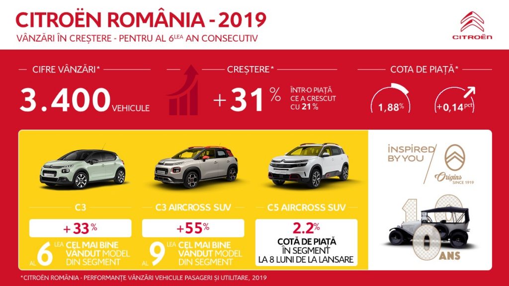 Marca Citroën, prin TRUST MOTORS, importatorul oficial în România, a înregistrat cel de-al șaselea an de expansiune în 2019, cu o creștere de 31% a vânzărilor într-o piața auto ce a crescut cu 21% față de anul 2018.