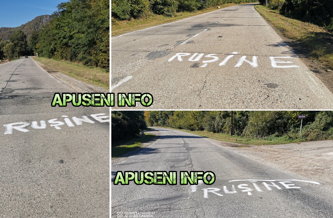 Un protest inedit faţă de starea proastă în care se află DN 75 a fost iniţiat în Apuseni. Pe ambele sensuri de mers a fost scris cu vopsea cuvântul ”Ruşine”.