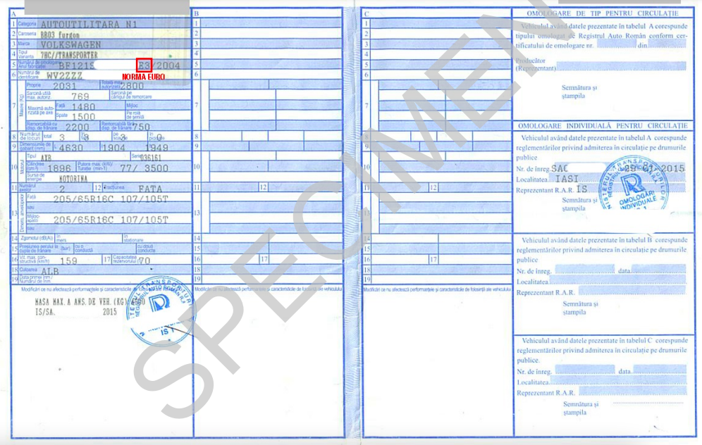 – la punctul 17 – Cod național de emisii – aici se regăsesc doar caracterele care indică norma Euro.