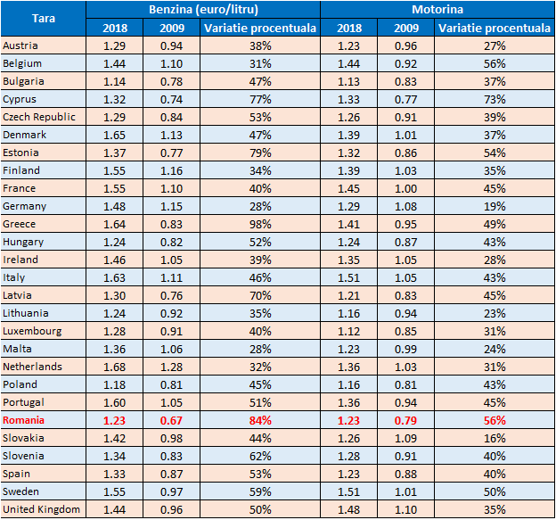 În urmă cu aproape 10 ani, la 1 ianuarie 2009, preţurile carburanţilor din România erau la jumătate faţă de nivelul actual, în acelaşi timp fiind şi cele mai mici din Europa. Trebuie menţionat că, spre deosebire de prezent, majoritatea statelor membre UE aveau preţuri mai mici la carburanţi. Totuşi, o comparaţie a preţurilor la benzină şi motorină publicate în Oil Bulletin la 1 ianuarie 2009 şi 13 august 2018 ne arată că cei 10 ani care au trecut, chiar dacă au adus creşteri de preţuri în toate statele UE, au produs cele mai semnificative creşteri procentuale în România şi Grecia.