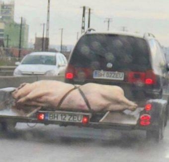Românul e inventiv în perioada sărbătorilor. Un bihorean a născocit o metodă neobişnuită pentru a transporta porcul tăiat: l-a legat pe trailer.