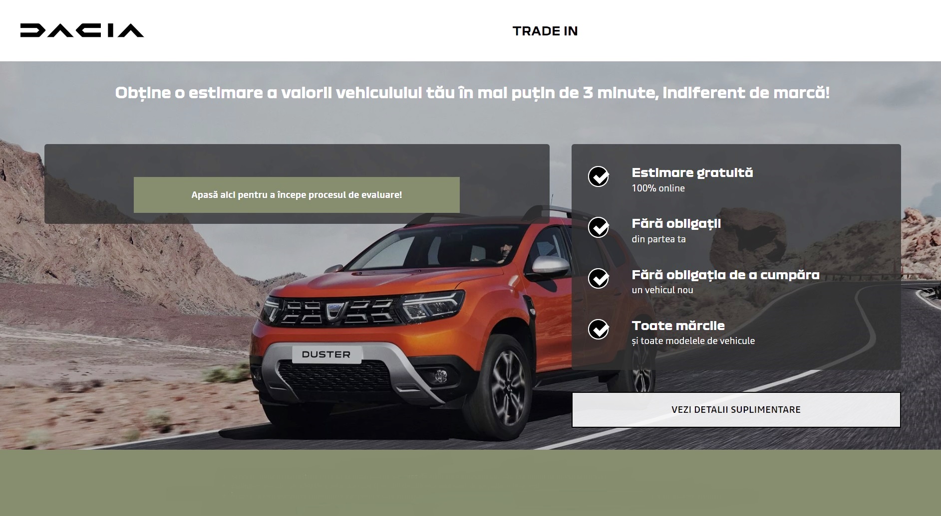 Reprezentanții Dacia și Renault anunță lansarea unor platforme online ce oferă servicii Trade-In pentru mașinile second-hand. În acest sens, clienții au la dispoziție două platforme dedicate unde pot face gratuit o estimare a prețului automobilului pe care îl dețin.