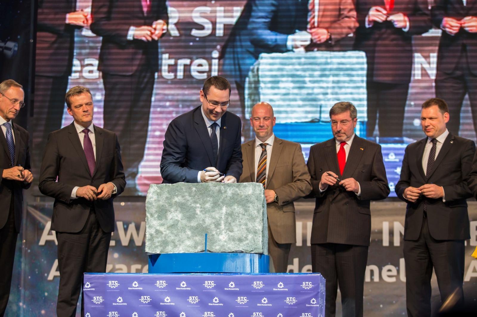 Ceremonia oficială de aşezare a primei pietre de temelie a avut loc în prezenţa Prim-ministrului Victor Ponta, dar şi a ambasadorului Germaniei în România, Werner Hans Lauk.