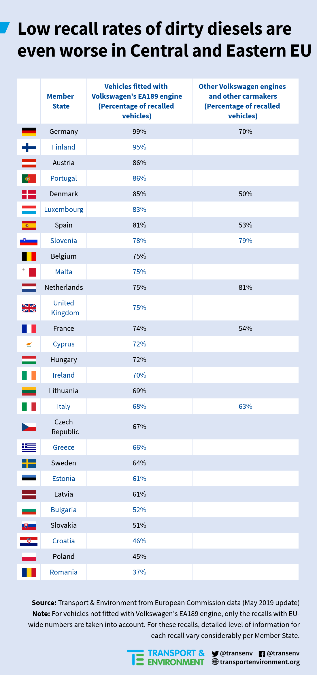 Asociaţia Transport&Environment, care a analizat datele, a anunţat că Guvernele statelor şi Comisia Europeană trebuie să accelereze procesul de rechemare la nivelul pieţei unice. În timp ce în statele Europei de Vest majoritatea maşinilor implicate în scadalul Dieselgate au fost rechemate, în Europa Centrală şi mai ales în Europa de Est, ritmul este foarte scăzut. România este pe ultimul loc la capitolul rezolvări, doar 37% dintre maşinile implicate în Dieselgate fiind rechemate.
