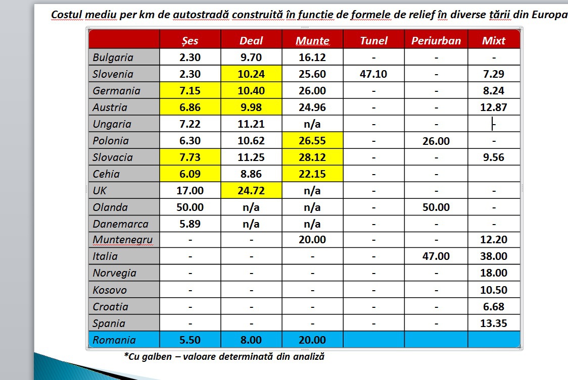 Astfel, potrivit documentelor oficiale, un kilometru de autostradă construit în România, la şes, costă 5,5 milioane de euro (fără TVA). În acelaşi timp, în zone de deal, un kilometru de autostrădă costă 8 milioane de euro (fără TVA), iar la munte costul ar creşte la 20 de milioane per kilometru (fără TVA).