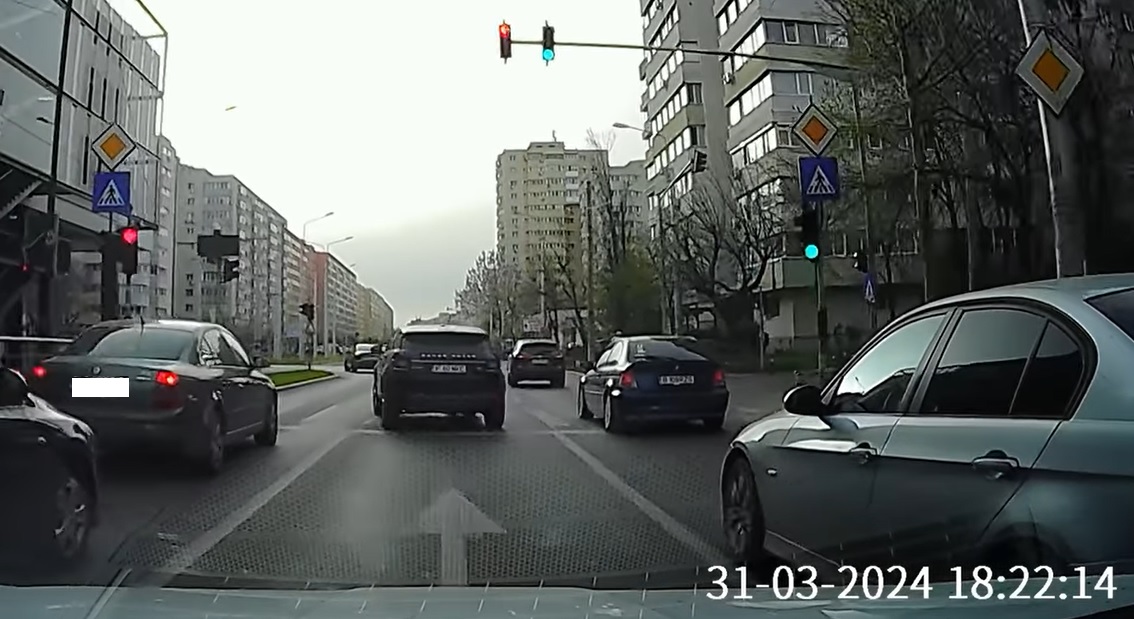 Cei doi șoferi au profitat că semaforul pentru direcția înainte este „verde” și au trecut, unul după altul, de acesta.