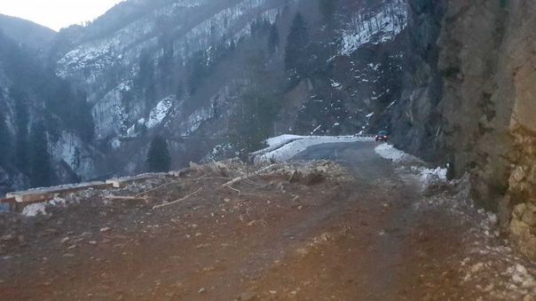 Pe aproximativ 100 de metri, drumul este plin de pământ şi pietre.