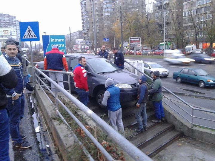 Nu ştim ce a văzut şoferul, dar cert este că maşina a ajuns suspendată pe trepte.