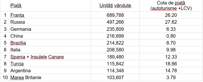 Cele mai importante 10 pieţe pentru grupul francez în 2018 au fost: