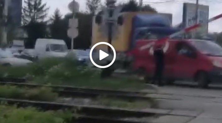 Şoferul neatent se apropiase prea mult de linia ferată şi bariera a coborât chiar pe maşina lui.
