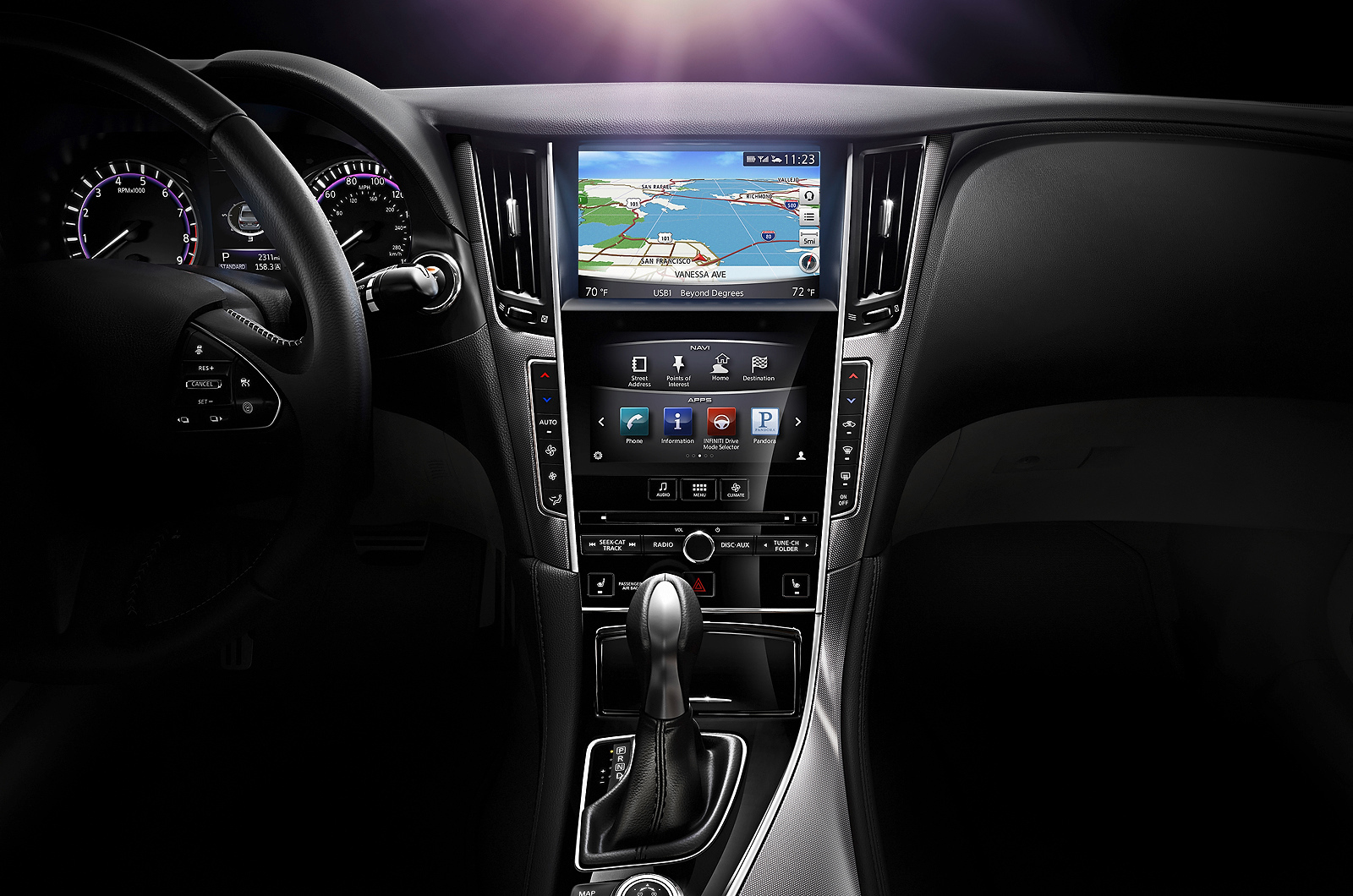 Interiorul lui Infiniti Q50 frapează nu doar prin calitatea excelentă a materialelor, ci mai ales datorită celor două displayuri de mari dimensiuni de pe consola centrală, parte a sistemului de infotainment ”Infiniti InTouch”.