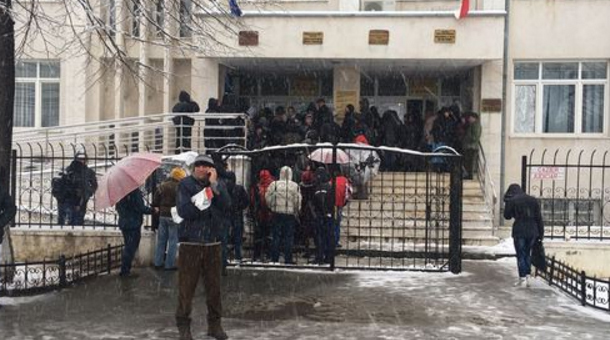 Persoanele sunt strigate şi trebuie să arate buletinul, totul petrecându-se afară, pe scările insituţiei, afară, întrucât conducerea Serviciului spune că are o capacitate a holului de doar 100 de persoane.