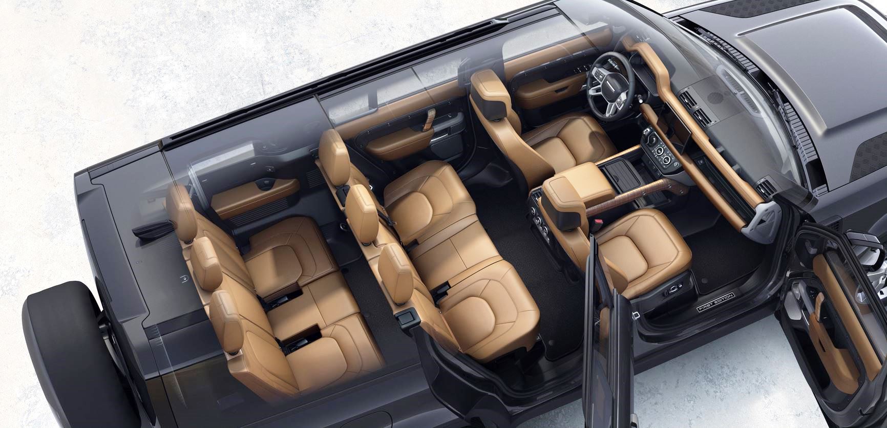 Ca dotări, noul Defender 130 oferă sistem de climatizare pe patru zone (opțional) și display central de 11,4 inch. În plus, cel de-al treilea rând de scaune, care poate găzdui lejer trei adulți, poate fi comandat cu funcție de încălzire.