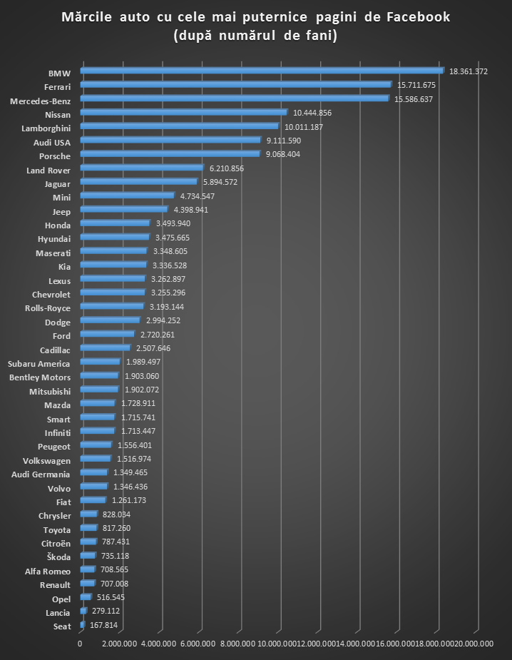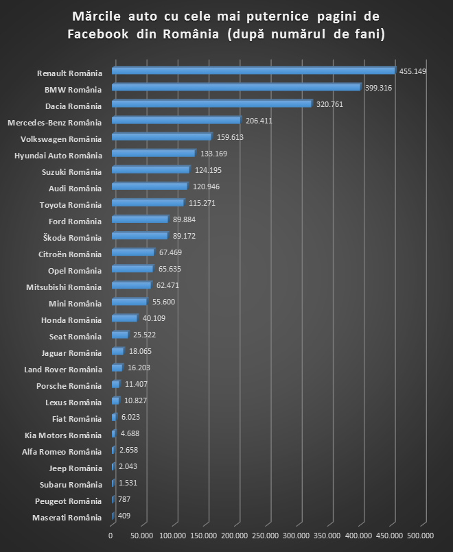 În România, situaţia stă puţin altfel. Pe primul loc se află Renault România (cu peste 455.000 de fani), pe locul al doilea este pagina BMW România (cu aproape 400.000 de fani), iar pe locul al treilea este Dacia România (cu peste 320.000 de fani).