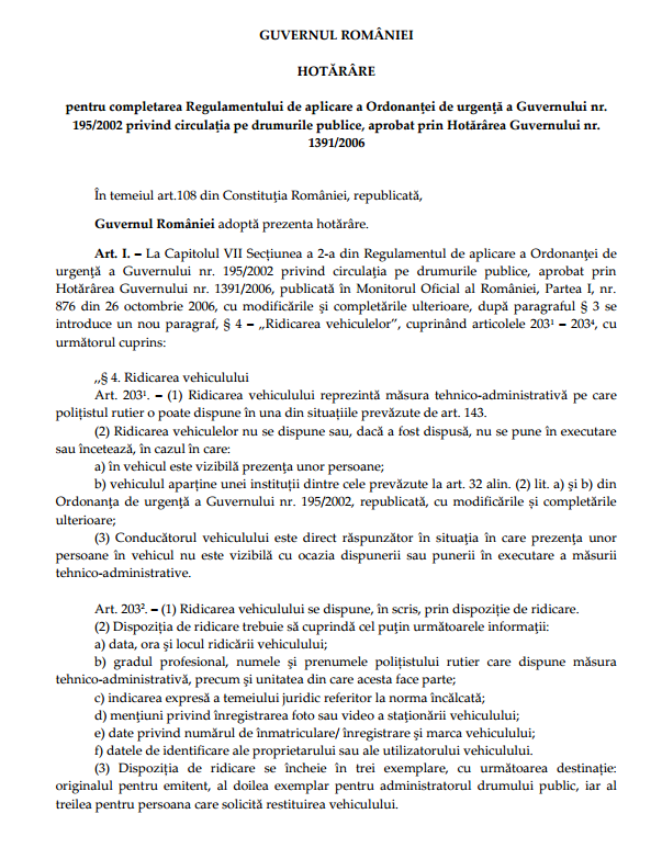 „Aplicarea măsurii tehnico-adminsitrative, în trecut, a cunoscut şi o serie de situaţii excesive, generate de lipsa unor prevederi clare sau chiar de interpretarea greşită a legii şi ignorarea scopului pentru care se realizează ridicarea vehiculului. În acest sens, se propune ca măsura să nu fie dispusă sau să înceteze executarea sa dacă în vehicul este vizibilă prezenţa unor persoane”, arată nota de fundamentare a proiectului de hotărâre de guvern.
