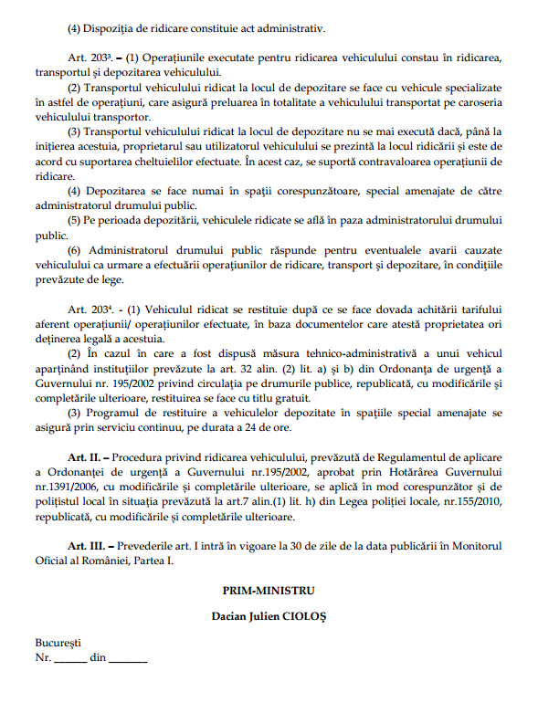 Proiectul dă dreptul administraţiilor publice locale sau administratorului drumului public în cazuă să pună în aplicare măsura ridicării vehiculelor parcate neregulamentar.