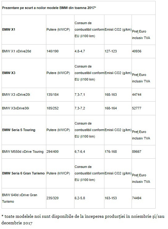 În paralele cu începerea celei mai mari ofensive de modele din istoria mărcii, BMW continuă diversificarea şi în cadrul gamei de modele existente printr-o multitudine de dotări noi ce sunt introduse din toamna 2017. Cu începere din noiembrie 2017, noile BMW M550d xDrive Touring şi BMW 640d xDrive Gran Turismo vor fi disponibile, în timp ce, din decembrie 2017, două noi variante de motorizări pe benzină vor fi oferite pentru noul BMW X3. Mai mult, varietatea de dotări cu echipamente speciale pentru noul BMW X3 va fi completată cu opţiuni exclusiviste pentru exterior şi interior de la BMW Individual.