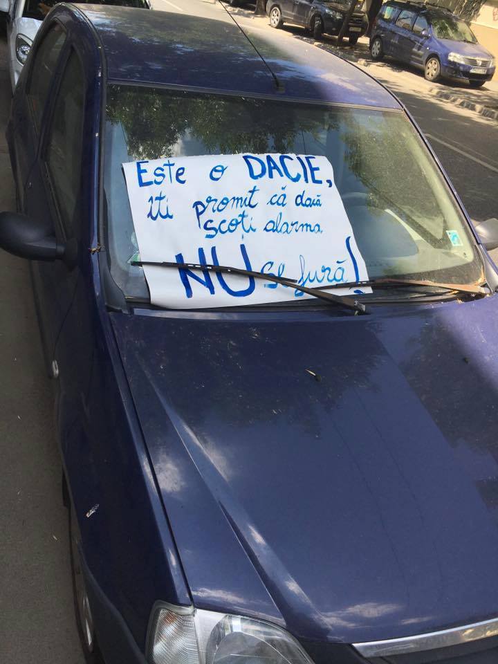 Aşa stau lucrurile şi în cazul Daciei din imagine. Probabil că un locatar din zona unde era parcată acest Logan, exasperat de sunetul alarmei, i-a lăsat un mesaj proprietarului. Nu ştim dacă acesta s-a lăsat convins, cert este că mesajul va fi recepționat, într-un fel sau altul.